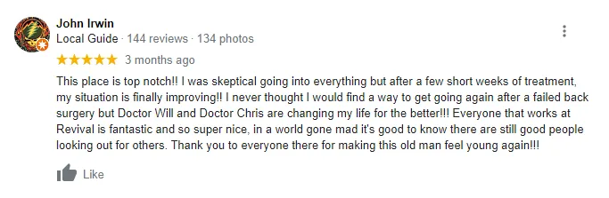 Disclaimer: Procedures and treatments performed by Revival Health and Wellness have an inherent success (and failure) rate. Reviews, testimonials and content on this site should not be interpreted as a statement of efficacy of procedures and treatments performed by Revival Health and Wellness for anyone else.